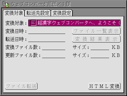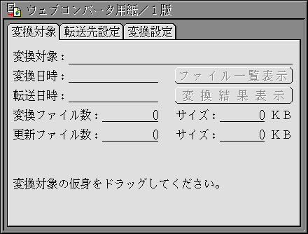 超漢字ウェブコンバータは、原紙型タイプのアプリケーションだ。新規に原紙を取り出して開くと(図1)、最初は何も設定されていない。〈変換対象〉の見出しに、発信したいデータのトップとなる仮身をドラッグ操作で登録する(図2)。ここで[HTML変換]スイッチをクリックすると、登録した実身を先頭にした実身/仮身ネットワーク群がブラウザでアクセスできるようなHTML文書に変換される(図3)。変換した結果は、[変換結果表示]スイッチをクリックして、その場で確認できる(図4)。