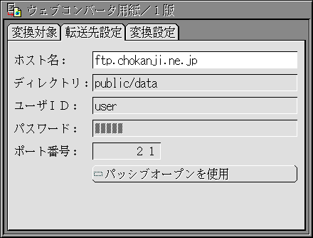 変換結果が確認できたら、プロバイダのウェブページ用サーバに、変換結果を転送する。まず〈転送先設定〉の見出しで、サーバに接続するために必要な情報を設定しておく(図5)。転送先設定が終ったら、再び〈変換対象〉の見出しに戻り、[ファイル転送]スイッチをクリックする。