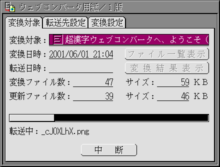 先程設定した〈転送先設定〉の見出しの内容に従って、自動的にサーバに接続し、転送を開始する(図6)。転送が完了したら、直接転送したウェブページにアクセスして、実身/仮身で作成したコンテンツがブラウザでも正常に表示できることを確認する。