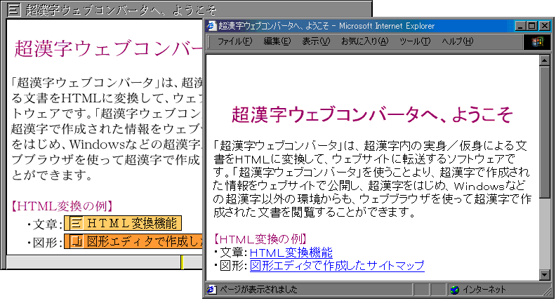 文章データ内の文字は、そのままブラウザに表示され、仮身はリンクに変換される(図7:左側が超漢字での表示。右側がWindows上のブラウザでの表示。以下、同様)。