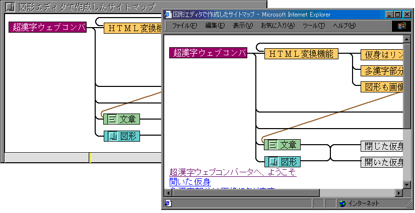 図形データはそのまま画像に焼きつけられ、ブラウザ内に表示される。図形データ内の仮身は、HTML規格で定められているイメージマップと呼ばれる画像に変換されるので、ブラウザ内で仮身の形に見える部分はリンクとして働き、それをクリックすればその文書にジャンプできる(図8)。
