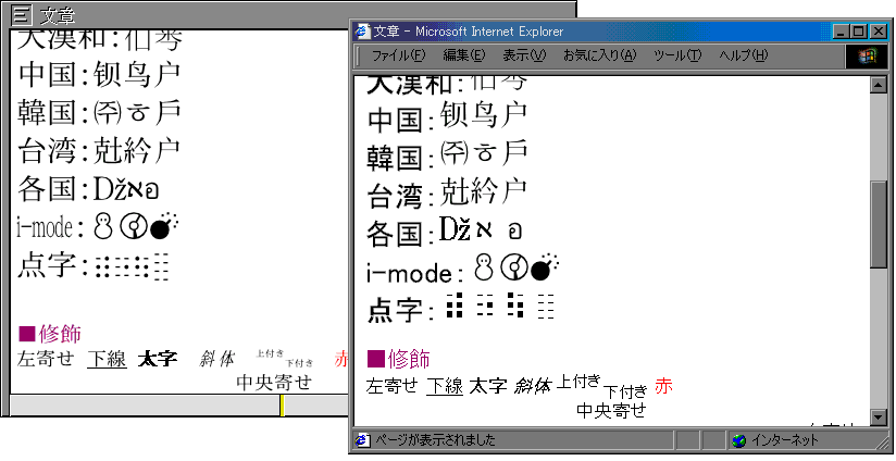 文字修飾や書式は、可能な範囲でHTMLタグに変換される。たとえば、下線/太字/斜体/上付き/文字サイズ・色に関する修飾は、それぞれ、ULタグ/Bタグ/Iタグ/SUPタグ/FONTタグで囲まれる。また中央揃えなどの揃え指定はDIVタグに変換される(図9:多漢字も表示されているが詳細は後述)。