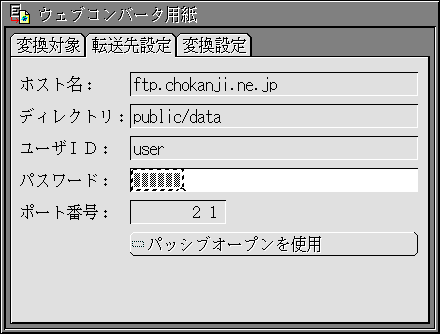 - 「転送先設定」の見出しのウィンドウで、変換結果をアップロードするftpサイトのホスト名、転送先ディレクトリ、ユーザID、パスワードを設定します。