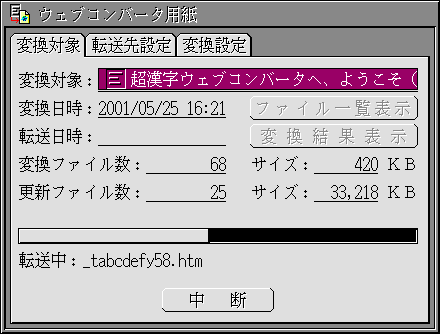 変換結果の転送が開始されます。転送中のHTMLファイル名と転送の進捗状態がウィンドウに表示されます。