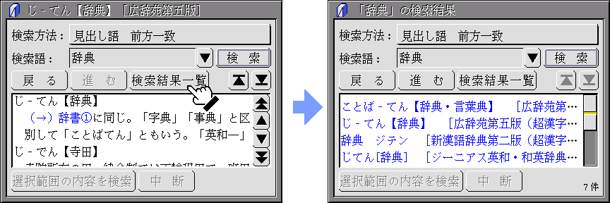 [検索結果一覧]スイッチをクリックすることによって、「じ-てん【辞典】 [広辞苑第五版(超漢字広辞苑)]」の解説文を表示する直前に検索した"「辞典」の検索結果"の画面に戻っています。