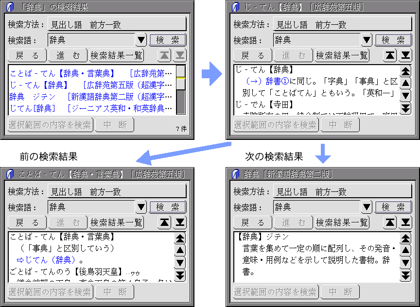 解説文が表示されている状態から[検索結果一覧]に戻らずに、前後の検索結果の見出しの解説文を見ることができます。