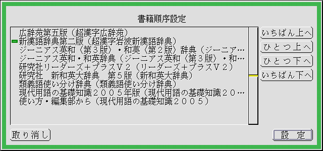 † 書籍順序設定パネルの設定を変更すると、[検索対象]メニュー、[著作権表示]メニュー(⇒「辞書の著作権表示を見る」))、[目次/凡例]メニュー(⇒「目次や凡例を見る」)の表示順も変わります。[検索対象]メニュー、[著作権表示]メニュー、[目次/凡例]メニューの表示順は、設定後ただちに変更されます。