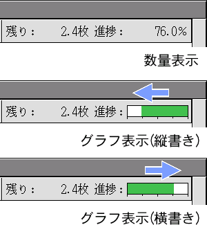 「残量(グラフ)」をONにすると、進捗をグラフで表示します。グラフは縦書き時は右から左へ、横書き時は左から右へ伸びていきます。