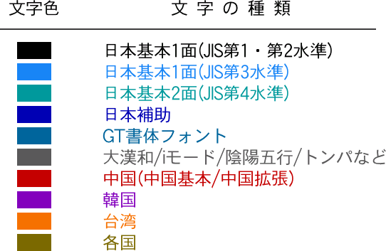 たとえば、一般的に使われているJIS第1水準・第2水準の文字は黒色で、補助漢字は紺色、中国漢字は赤色で表示されます。