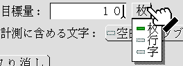 達成量表示は、原稿の枚数・行数・文字数からいずれかの単位を指定します。単位の設定は「目標量」の欄の「枚」と書いてあるポップアップセレクタの"枚""行""字"から選びます。