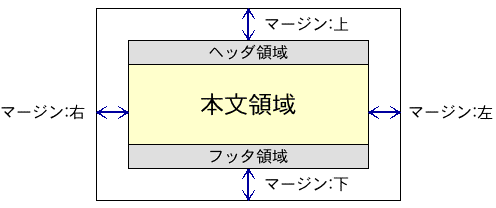 本文領域とは、レイアウト用紙(原稿用紙設定で選択した「用紙」)から、上下左右のマージンを除いた領域のことです。この本文領域内の上端にはヘッダを印刷するためのヘッダ領域、下端にはフッタを印刷するためのフッタ領域がとられます。