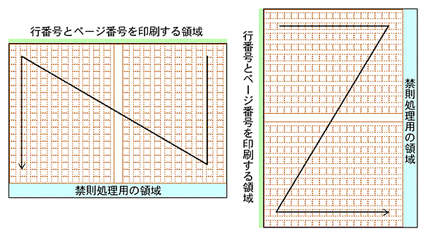 † 上の図は縦書きの場合ですが、横書きの場合も同様の方法で原稿領域が決定されます。原稿領域が、上下左右のマージンを超過する場合は、縦書きの場合は本文領域と原稿領域の右上隅が一致する位置に、また横書きの場合は本文領域と原稿領域の左上隅が一致する位置に、それぞれ原稿領域が決まります。