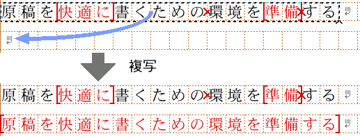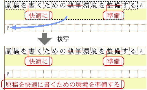 - 赤ペン詳細モードで、挿入枠や打ち消し線を含む文字列を選択し、2行目に複写します。"原稿を"から"する"までを選択枠で囲み、2行目の先頭に複写します。