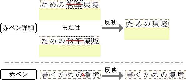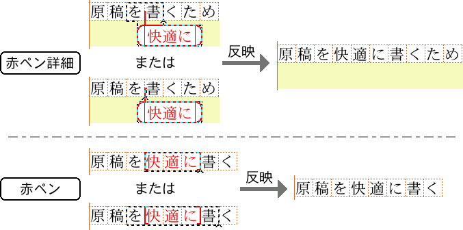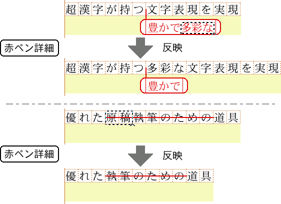 赤ペンモードや赤ペン詳細モードで修正した文字列は、そのままでは元原稿に反映されません。