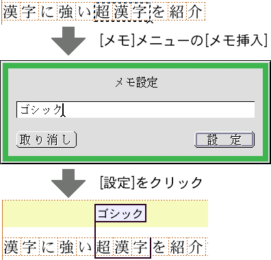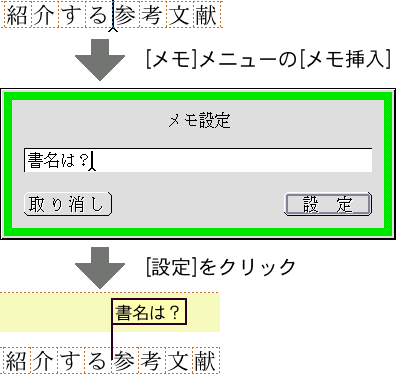 - 範囲なしメモを挿入するときは、挿入したい地点にカーソルを置き、[メモ]メニューの[挿入]を選びます。