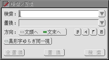 文書内の文字列を検索または置換するときは、[検索]メニューの[検索/置換]を選びます。検索/置換のウィンドウが現れます。