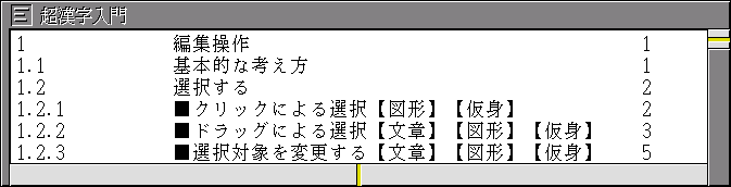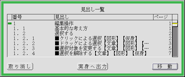 本文に「見出し」を付け、見出しの付いている箇所を一覧に表示したり、別の実身に出力したりできます。また、一覧から指定した見出しの位置へ移動できます。見出しは、文書の章節構造を把握したり、目次の作成に利用できます。