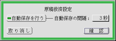 † 自動保存機能は、不慮の事故に備えてデータを保持しておく機能であり、保存操作の代用機能ではありません。自動保存を設定していても、超漢字原稿プロセッサを終了するときには、保存操作(通常の保存操作)を行ってからウィンドウを閉じてください。