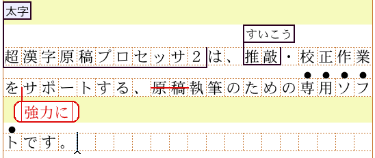 【#メモ∥太字】超漢字原稿プロセッサ2【#】は、【⌒ルビ∥すいこう】推敲【⌒】・校正作業を【▲ツイカ】強力に【▲】サポートする、【△トル】原稿【△】執筆のための【¨圏点∥黒丸】専用ソフト【¨】です。