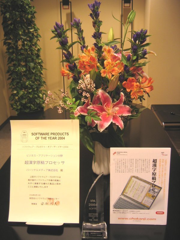 「超漢字原稿プロセッサ」が「ソフトウェア・プロダクト・オブ・ザ・イヤー2004」の「ビジネス・アプリケーション分野」の部門で受賞いたしました。