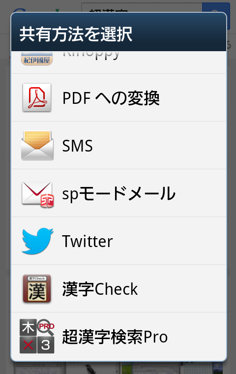 ウェブブラウザなどの他のアプリケーションで選択した文字を、共有機能を使って超漢字検索の検索条件として入力することができます。