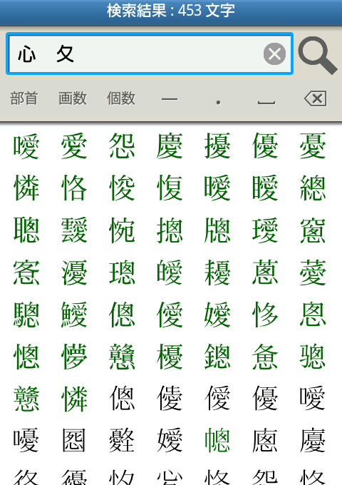 - 検索したい文字の構成部品、読み、画数などの組み合わせによる、 直感的で分かりやすい検索方法を搭載しています。