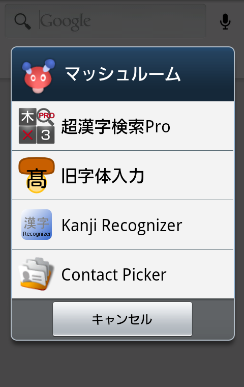 - 「マッシュルーム」とは、Androidで使える日本語文字入力の拡張機能です。日本語入力アプリ「Simeji」や、その他の文字入力アプリ(iWnn、OpenWnn、ATOK for Androidなど)による文字入力の際に、超漢字検索Proで検索した漢字も使えるようになります。