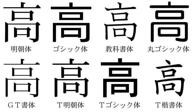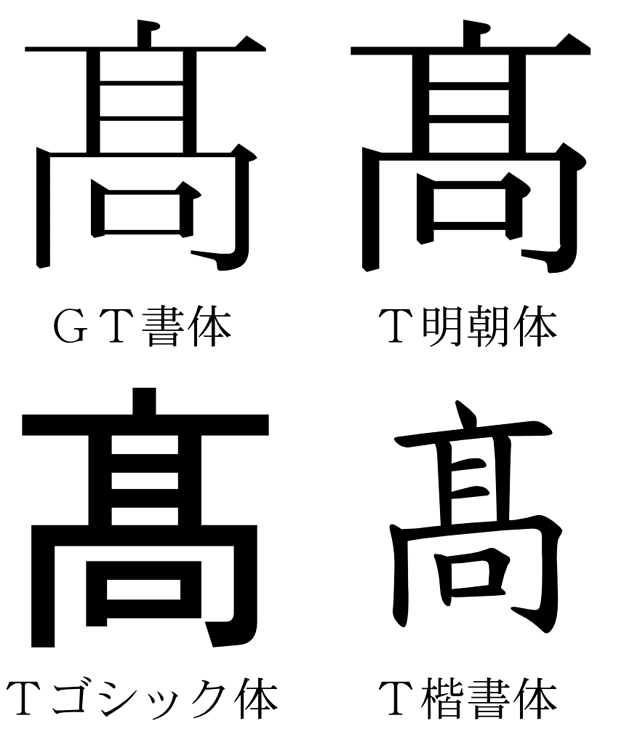 - 利用できる書体の例(JIS第1、第2水準漢字範囲)