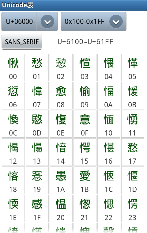 「Unicode表」は、内蔵フォントを使用して、Unicodeの文字コード表を256文字ずつ画面に表示するアプリです。