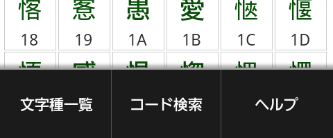 - [コード検索]:文字または16進コードポイント(U+{XXXXX})、UTF-8 形式の16進コード({XX} {XX} ...)を指定して、その文字の詳細ダイアログを表示します。