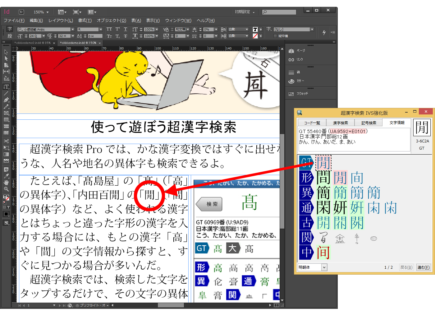 - メモ帳、Word、Excel、InDesignなどのWindowsアプリケーションで扱う文書の中に、超漢字検索で検索した多漢字や異体字を文字として貼り込めます。5万字以上の漢字に対応済であるほか、今後のデータウェアの整備により、対応可能な漢字を増やしていきます。