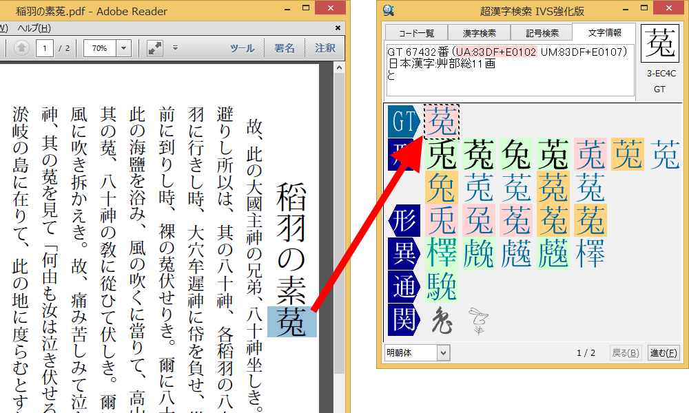 - PDF文書などに含まれている異体字がAdobe-Japan1コレクションのIVSを使っていた場合に、同じ字形を持つ汎用電子コレクションの異体字に置き換えて入力する。