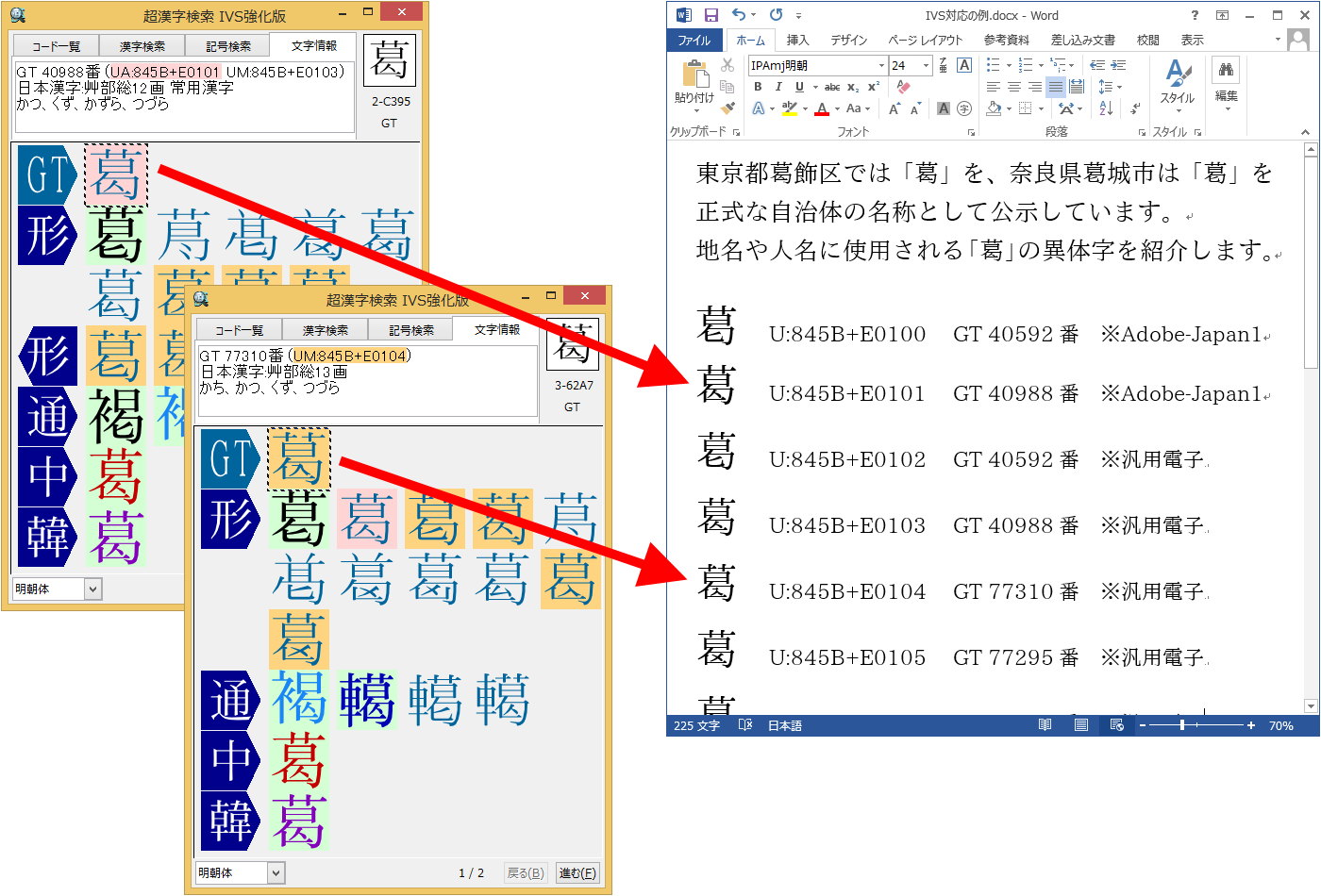 - Windowsの文書中に貼り込まれる多漢字や異体字は、Unicode IVSの機能を用いてコード化されます。外字ではないので、環境が変わっても文字化けせず共通に利用でき、多漢字や異体字を含むデータの互換性や流通性の向上が期待できます。