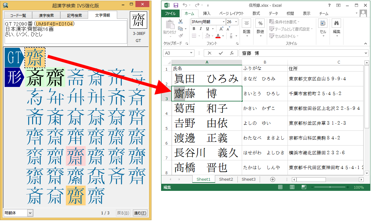Excelのシートに汎用電子コレクションの異体字を貼り込んだ例
