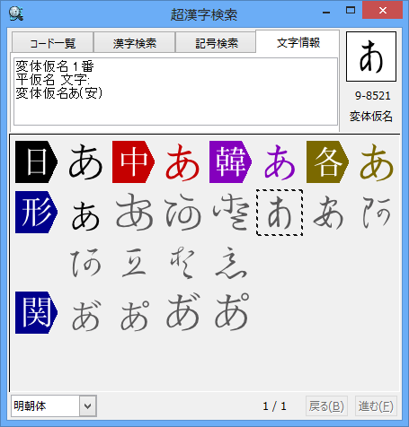 JIS2004で代表字形の変更された漢字についても、変更前後の漢字を異体字(異形字)として表示し、両者の字形を見比べて選択することができます。
