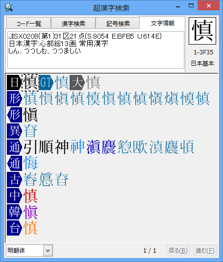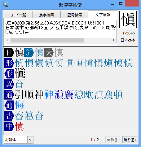 特に、人名用の異体字や旧字体の文字を探す時は、漢字の部品や読みで検索するよりも、よく使う漢字の異体字として検索するのが効率的です。たとえば「愼」の場合、「慎」の異体字として入力するのが簡単です。
