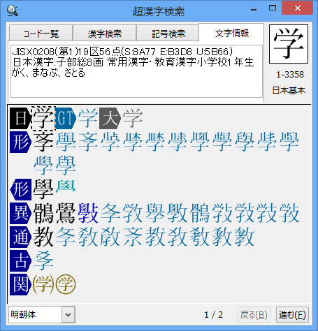 新字体と旧字体との対応、中国や韓国の漢字との対応、漢字とトンパ文字との対応、ひらがなと変体仮名の対応、類似した記号の一覧など、関連する文字について幅広い情報を提供します。