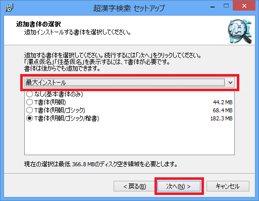 - 「追加書体の選択」が表示されるので、「最大インストール」を選択し、[次へ]をクリックします。