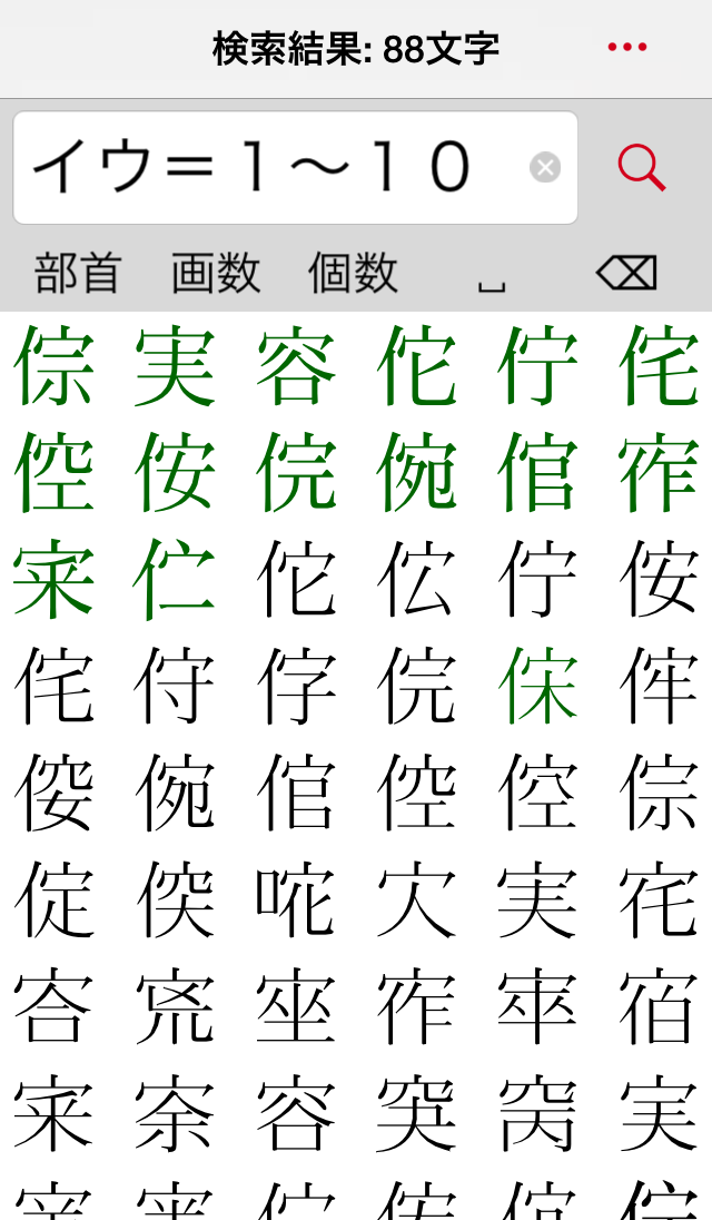 「イ」「ウ」を「にんべん」や「うかんむり」の代りに使うなど、形の似たカタカナも検索キーとして使えます。