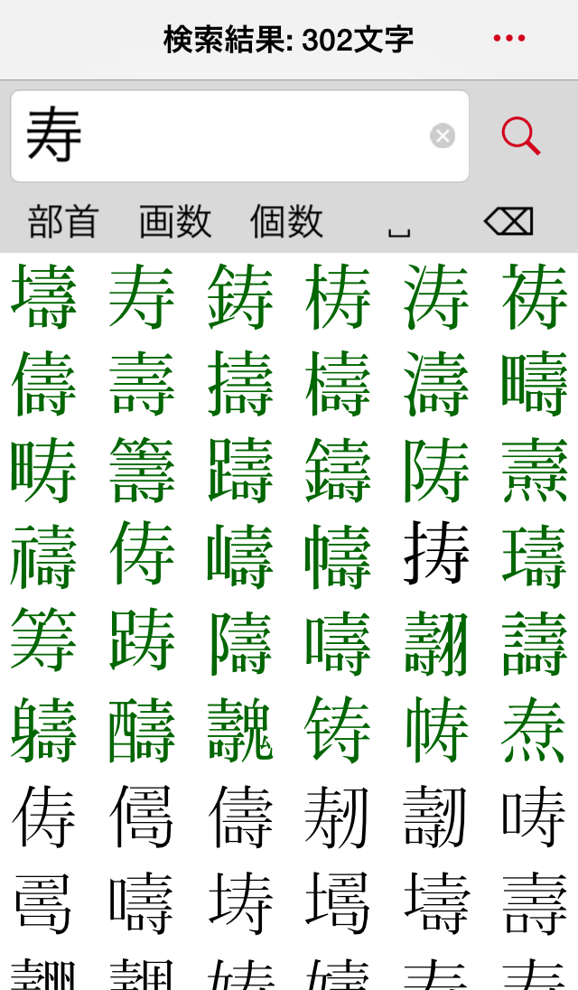 さらに、「区」と「區」、「広」と「廣」、「竜」と「龍」、「一点しんにょう」と「二点しんにょう」のような異体字関係にある部品も含めて、自動的に検索します。たとえば、「寿」をキーにした場合、「梼」だけでなく、「寿」の異体である「壽」を含んだ「檮」も同時に検索できます。