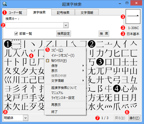 超漢字検索のウィンドウは以下のように構成されています。