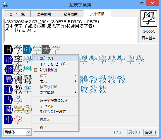 また、超漢字検索の1つのウィンドウに〈コード一覧〉や〈文字情報〉の画面を開いておき、別の超漢字検索で検索した文字をコピーして貼り付けると、コード番号、読み、異体情報などがわかります。