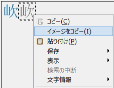 - 文字表示エリア、または文字一覧エリアで右クリックメニューの[イメージをコピー]を選びます。