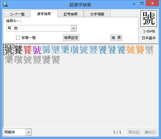 †以下の検索結果例は、検索設定ダイアログで、検索範囲を「日本基本」に設定したときに現れる、JIS第1水準範囲の結果の一部です。