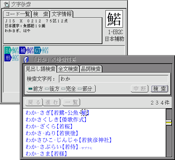 図1は、「わか」で検索し、該当する見出し語を表示したところだ。「わか‐さぎ」の「魏凵vはJIS第1・第2水準に含まれない漢字(これは補助漢字)である。Windows などで動作する一般的な電子辞書ソフトでは、この文字は外字などの方法で扱われる場合が多い。