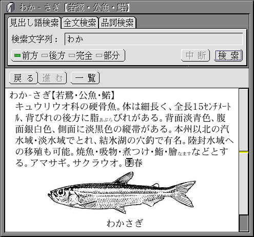図2は、図1の状態から「わか‐さぎ」を選択したところだ。書籍版の「広辞苑」と同様に、この項目には図版も付属している。