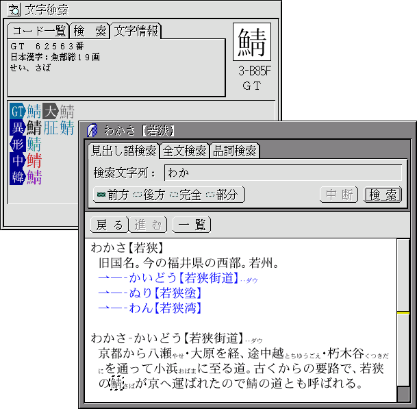 図3は、図1の状態から「わかさ」を選択したところ。青色で表示されている【若狭街道】【若狭塗】【若狭湾】は、【若狭】の追込項目(子項目)であり、クリックすると直接その項目を参照できる。【若狭街道】の説明に出てくる「さば」の字形は、書籍版の広辞苑と同じものである。これに対して、Windows などで動作する一般的な電子辞書ソフトでは、JIS第1・第2水準の代表字形である「鯖」で代用される場合が多い。「超漢字広辞苑」の画面に表示された「さば」の文字を文字検索のウィンドウにドラッグすると、字形の違いがよく分かる。