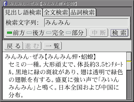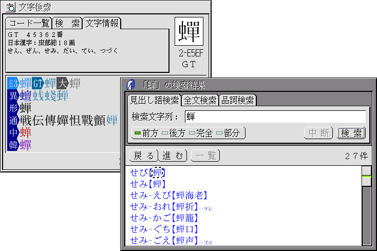 図4は、「蝉」を含む見出し語を検索した例だ。この場合の検索文字列は、通常のかな漢字変換で出てくる「蝉」(JIS第1水準)を使ってもよいし、字形の正確な「