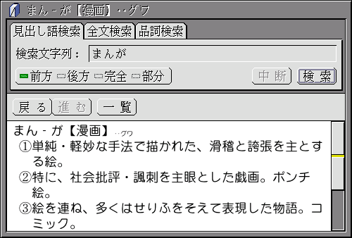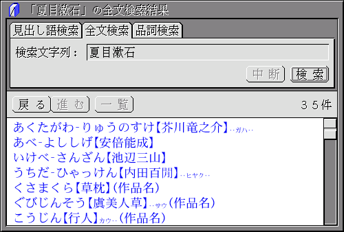 見出し語に限らず、各項目の説明文中の文字列をキーワードとして検索できる。図5には、「夏目漱石」の文字列で全文検索を行った結果を示した。芥川竜之介など夏目漱石と関係の深い作家名や、夏目漱石の作品名などがヒットしている。