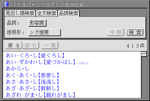 「超漢字広辞苑」は、品詞を指定して検索する機能も持っている。図6は、シク活用の形容詞(文語)を検索した例。